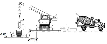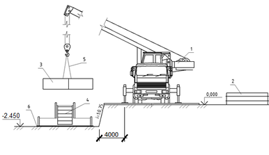 1 - кран автомобильный КС-7474; 2 - площадка складирования; 3 - щиты опалубки; 4 - арматурный каркас; 5 - строп; 6 - бетонная подготовка