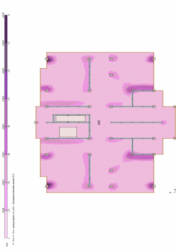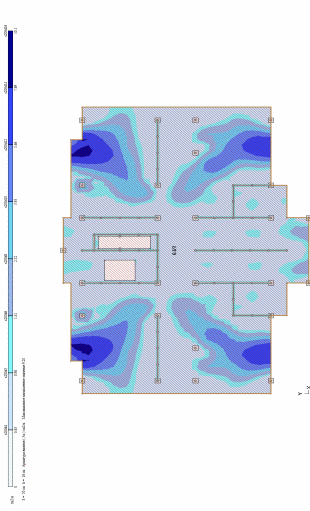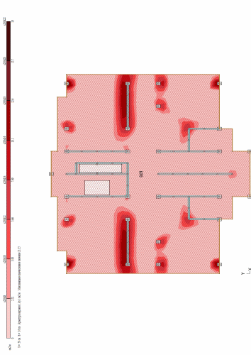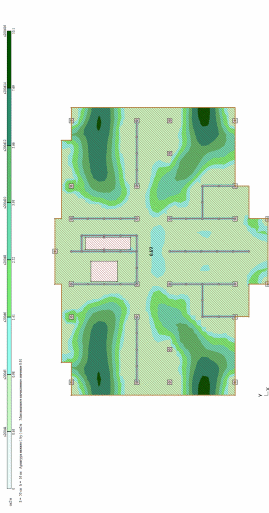 Построение изополей выполняется только для расчетного армирования. Цветовая шкала дает представление о величине площади армирования в точках плиты. В графическом и цифровом виде может быть показана как расчетная, так и остаточная площадь арматуры. Команды доступны при выбранном виде армирования — у верхней грани плиты, у нижней грани плиты или поперечном. Значения продольной арматуры приведены в см2 на 1 погонный метр сечения плиты, поперечной — в см2 на 1 погонный метр сечения плиты при расчетном шаге 1 метр.