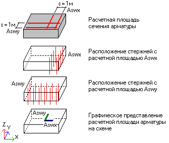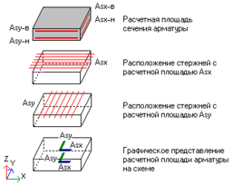 площадь арматуры вдоль осей x и y в графическом и цифровом виде;