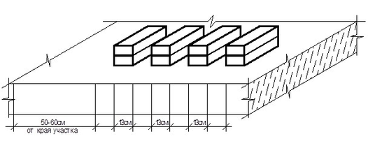 При кладке наружной версты тычкового ряда каменщик 3р. берет из пакета (поддона) по два лицевых кирпича и, отступив от края участка (захватки) на 50 – 60 см, раскладывает их на внутренней половине стены тычковыми гранями параллельно стене, по два кирпича с интервалом в 12 - 13 см между стопками, см. рис. 3.6: