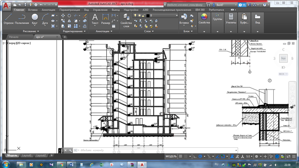 Разрез здания выполняется на основе решения плана с учётом принятой конструктивной системы. Плоскость разреза должна проходить по наиболее характерным частям здания для полного представления его объёмно-планировочного и конструктивного решения. Как правило, разрез выполняется по лестничной клетке или входу здания. На разрезе должны быть показаны основные конструкции.