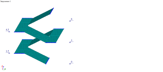 Для более достоверного распределения усилий в элементах лестничного марша и площадки на отметке +3,000 в расчетную схему включены лестничные площадки на отметке +1,500 и +4,500, и монолитно связанные с ними лестничные марши.