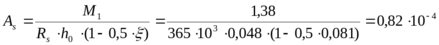 Расчет арматуры в промежуточных пролетах при рабочей высоте сечении плиты h0 = 8 – ∆з.с. – 0,5·d = 6 – 1 – 0,5 · 0,4 = 4,8 см (принят диаметр арматуры 4 мм).
