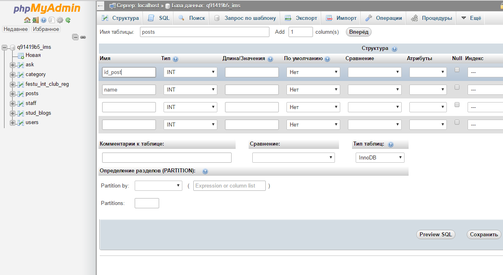 Рисунок 15 – Создание таблиц в phpMyAdmin