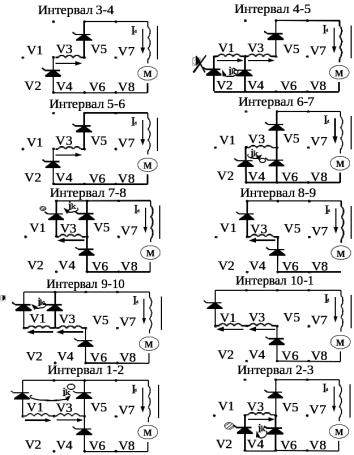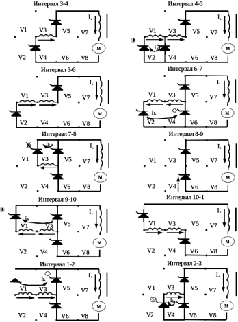 V6 подаётся нерегулируемый по фазе импульс α0 в контуре V4-V6 происходит коммутация тока, в результате того тиристор V4 закрывается, а тиристор V6 открывается и вступает в работу. На интервале 7-8 на плечо V3