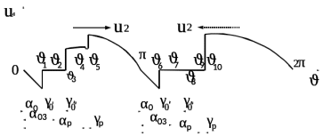 остаётся в проводящем состоянии поэтому на интервале 3-4 выпрямленное напряжение ровно нулю, а на интервале 4-5 в момент соответствия точек на диаграмме напряжеия преобразователя как указано на рисунке 2.12 на плечо