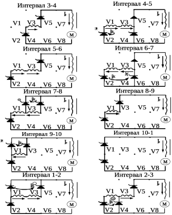 2-3 на плечо тиристора V4 подаётся задержанный по фазе импульс α03 в контуре V4-V6 происходит коммутация тока, ток в плече V4 возрастает, а в плече V6 падает до нуля. Наинтервале 3-4 в работе к двигателю прикладывается напряжение обусловленное одной секцией, вторичной обмотки тягового трансформатора. На интервале 4-5 в момент времени соответствии точки диаграммы напряжения преобразователя, на тиристор плеча V2 подаётся импульс управления αрег в контуре V2 и V4 происходит коммутация тока, с плеча V4 на плечё V2. На интервале 5-6 в момент времени соответствия образуется буферный контур протикания тока двигателя, через ток плечей V2 и V1. На интервале 6-7 на тиристор плеча V6 подаётся не регулируемый по фазе импульс α0 комутация с плеча V2 на плечё V6 происходит в большом контуре тиристор плеча V2 закрывается, а тиристор плеча V6 вступает в работу, так как коммутация произошла напряжение будит ровно нулю. На интервале 7-8 согласно рисунку 2.15 в момент времени соответствуюего интервала на тиристор плеча V3 подаётся задержанный по фазе импульс α03, в малом контуре тиристор плеча V1 и тиристор плеча V3 вторичной обмотки тягового трансформатора происходит коммутация тока, согласно рисунку 2.16, тиристор плеча V1 закрывается, а тиристор плеча V3 открывается. На интервале 8-9 к двигателю прикладывается напряжение обусловленное выводами одной из секции вторичной обмотки тягового трансформатора.