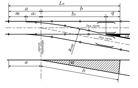 Схема обыкновенного стрелочного перевода в рельсовых нитях и осях путей приведена на рисунке 3.