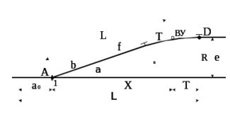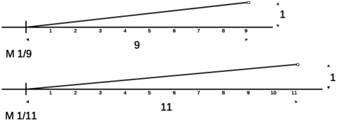 то для произведения масштабной укладки необходимо отложить в прямом направлении по оси X количество равных частей, которое указано число в знаменателе марки стрелочного перевода. Затем, стоит отложить по перпендикуляру одну часть (число, содержащееся в числителе марки стрелочного перевода) вверх. После, соединяя начальную и конечные точки образуется необходимый угол, который и является марочным углом крестовины