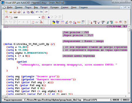 Первым, и самым основным содержанием разработки является написание программного кода для различных проектных процедур модуля. В среде AutoCAD имеется Visual Lisp – встроенный интерпретатор программного кода, который создан для написания, отладки и реализации программ [9].