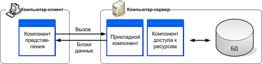 RDA-модель (более технологичная) существенно отличается от FS-модели характером компонента доступа к информационным коды компонента представления и прикладного компонента совмещены и выполняются на компьютере-клиенте. Он поддерживает как функции ввода и отображения данных, так и чисто прикладные функции [18]. Доступ к информационным ресурсам обеспечивается либо операторами специального языка (языка SQL, если речь идет о БД), либо вызовами функций специальной библиотеки (если имеется соответствующий интерфейс прикладного программирования – API).