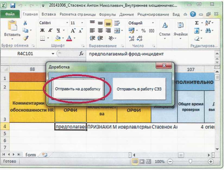 Если критерий «Результат ОРФИ» выставлен некорректно, заявку необходимо отправить на доработку сотруднику. Для этого в сводном промежуточном реестре необходимо удалить все те заявки, по которым критерий «Результат ОРФИ» выставлен корректно, затем нажать сочетание клавиш Ctrl+Q. В открывшемся окне нажимаем кнопку «Отправить на доработку» (рисунок 30).