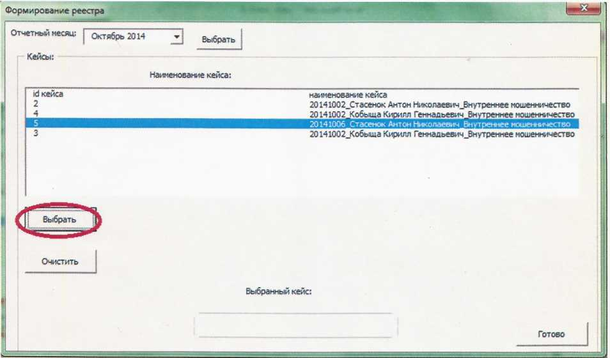 В окне «Наименование кейса» появится весь список реестров, поступивших в работу в выбранном месяце. Левой кнопкой мышки кликаем на тот реестр, о котором пришло автосообщение на почту ответственного сотрудника, в нашем примере – это «Реестр 5». После этого нажимаем кнопку «Выбрать» (рисунок 28).