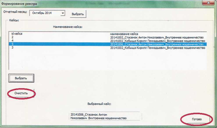 В поле «Выбранный кейс» появляется инфо по кейсу (дата выгрузки, ФИО Заказчика, причина выгрузки, иная информация). Если кейс выбран ошибочно, отжимаем кнопку «Очистить» (рисунок 29). Из поля «Выбранный кейс» информация удаляется, заново выбираем одним кликом нужный кейс. Если кейс выбран верно, нажимаем кнопку «Готово» (рисунок N), после чего формируется сводный промежуточный реестр по итогам проверки ОРФИ.