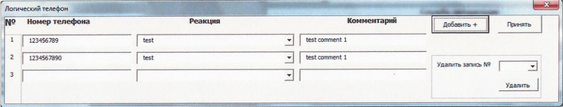 Рабочее поле дает возможность прописать несколько номеров телефонов, по каждому номеру выбрать свою реакцию и прописать комментарии. Для этого нажимаем кнопку «Добавить» и появиться чистые поля для внесения информации по каждому новому номеру. Максимальное количество номеров, которое может быть занесено равняется десяти. После того как прозвон в блоке «Логические телефоны» закончен нажимаем кнопку «Принять». Рабочее окно закроется, информация сохранится в соответствующих полях блока «Логические телефоны». Далее переходим к заполнению и прозвону следующего блока – «Личный номер телефона», и т.д. (рисунок 22).