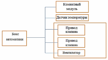 Данная система состоит из контроллера, комнатного модуля, датчика температуры и вентиляторного доводчика. Комнатный модуль связан с контроллером при помощи интерфейса PPS2, датчик температуры подсоединен к аналоговому входу контроллера. С приводов клапанов поступает сигнал на аналоговые входы контроллера об их состоянии – открыт/закрыт. Три скорости вентилятора регулируются дискретными выходами контроллера.