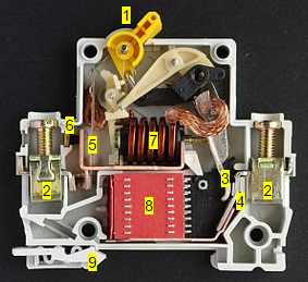 Электромагнитный расцепитель (отсечка) - расцепитель мгновенного действия, представляет собой соленоид (7), подвижный сердечник которого также может приводить в действие механизм расцепления. Ток, проходящий через выключатель, протекает по виткам соленоида и вызывает втягивание сердечника при превышении заданного порога тока. Мгновенный расцепитель срабатывает очень быстро, чего не скажешь о тепловом, но при значительно большем превышении тока: в 2÷10 раз от номинала, в зависимости от типа.