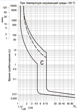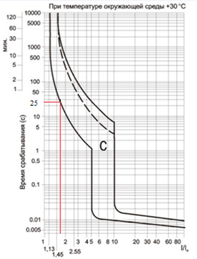 Для двигателей малой мощности применяется автоматический выключатель с время токовой характеристикой типа С, которая показана на рисунке 4.3. Кратность тока протекающего в цепи к номинальному току автомата (I/In) изображает ось Х, а время срабатывания, в секундах – ось У.
