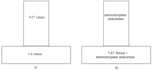 Гостинца имеет вид перевернутой Т-образной формы, рисунок 2.5 а. На 1 – 4 этажах будут размещаться бальный зал, зал бракосочетания, магазины, бары, рестораны и другие общественные помещения. На этих этажах применяются системы кондиционирования с VAV - боксами и вентиляторными доводчиками, рисунок 2.5 б.
