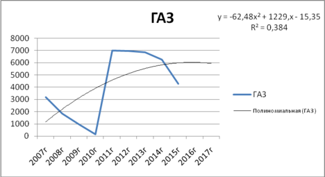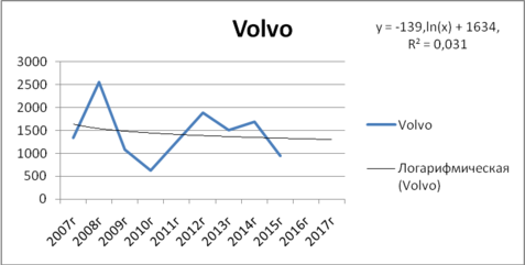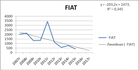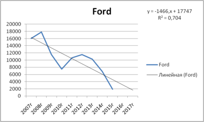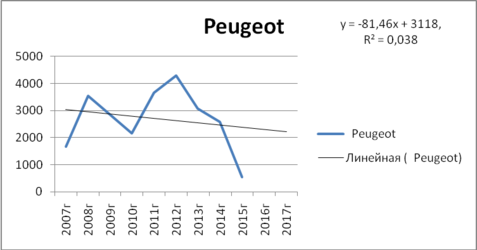 У легковых автомобилей марки Peugeot(рисунок 27) c 2011 года происходит резкий спад продаж. Если в 2011 году количество проданных машин составляло 4250 штук, то к 2015 году количество продаж составило 500 штук. Из представленной трендовой модели можно сделать вывод о том, что к 2017 году количество проданных автомобилей данной марки должно составить 2250 штук.