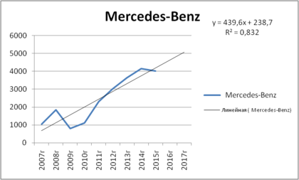 Как видно из представленного ниже графика (рисунок 19) с самого начала появления данной группы автомобилей на Российском авторынке, продажи данной группылегковых автомобилей были не высокими и в 2011 году происходит резкое возрастание продаж, количество проданных машин достигает 7000 штук и к 2015 году оно уменьшается до 4000 штук. Но к 2017 году данная марка машин будет стараться вернуть свои максимальные продажи.