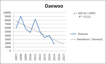 У автомобилей марки Daewoo (рисунок 26) с 2010 года происходит спад продаж, если в 2008 году количество проданных машин составляло 9000 штук, то к 2015 году продажи сократились до 2000. К 2017 году количество продаж не изменится.