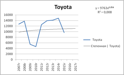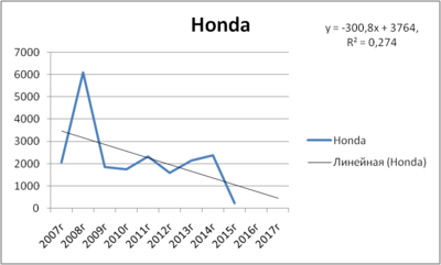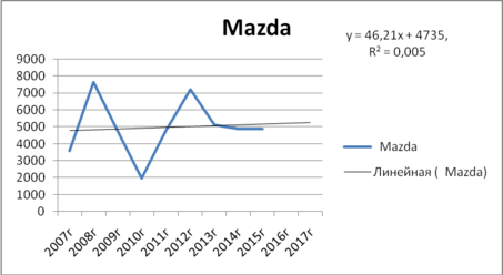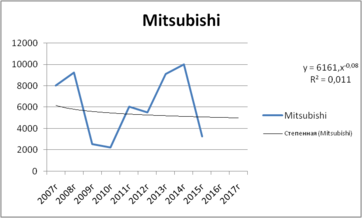 У Mitsubishi с 2007 года наблюдается большое количество продаж, на графике рисунка 17 видно, как происходит быстрый рост продаж, затем с 2008 года начинается спад продаж легковых автомобилей, количество проданных машин составило более 5000 штук.С 2012 года данная марка набирает свои обороты продаж и уже в 2014 годуколичество проданных автомобилей составило 10000 штук и далее опять происходит резкий спад продаж. С помощью трендовой модели можно сделать вывод о том, что ситуация по продажам у данной марки постепенно будет налаживаться, количество проданных машин будет составлять более 5000 штук.