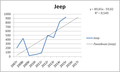 У автомобилей группы FIATChryslerAutomobiles ситуация критичная, почти у всех марок автомобилей продажи резко спали, к 2017 году ситуация не улучшиться и продажи автомобилей останутся на том же уровне, что и в 2015 году. Другая ситуация у автомобилей марки Jeep (рисунок 31),с 2008 года был спад продаж, но с 2010 года продажи автомобилей увечились более, чем в три раза, по сравнению с 2007 годом. К 2017 году продажи легковых автомобилей данной марки будут проходить успешно.
