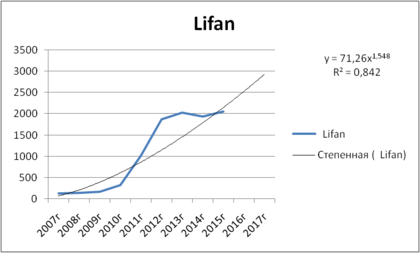 Как видно из представленного ниже рисунка 29, автомобили марки Lifan продаются успешно, с 2010 года возрастает количество проданных автомобилей, если в 2007 году количество проданных машин составляло около 100 штук, то к 2015 году количество проданных машин составило 2000 штук. К 2017 году продажи автомобилей должны увеличатся, и количество проданных машин должно составить около 3000 штук.