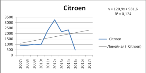 У группы машин Citroen (рисунок 28) похожая ситуация. С 2011 года происходит огромный спад продаж легковых автомобилей. Если в 2011 году количество проданных автомобилей составляло более 3000 штук, то к 2015 году количество проданных машин составило 500 штук. Из представленной трендовой модели можно сделать вывод о том, что ситуация у данной марки наладиться, уже к 2017 году количество проданных машин должно составить более, чем 2000 штук.