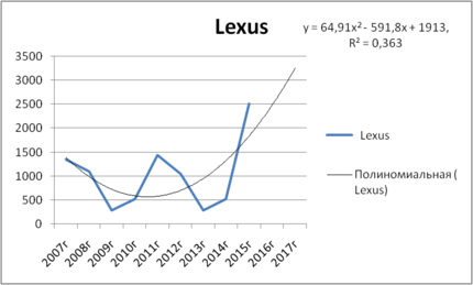 К 2017 году (рисунок 12) данная марка должна набрать свои обороты по продажам после резкого спада.У автомобилей марки Lexus (рисунок 13) ситуация иная, резкого увеличения продаж машин не наблюдалась со второй половины 2010 года. И вот к 2015 году продажи машин данной марки набирают свои обороты, они больше, чем в два раза увеличили свои продажи, по сравнению с 2014 годом, и в дальнейшем будет продолжаться данная тенденция.
