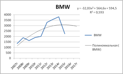 Со второй половины 2011 года у группы легковых автомобилей BMW происходит рост продаж автомобилей. С 2014 года автомобили начинают меньше пользоваться спросом и продажи сокращаются, к 2015 году количество проданных легковых автомобилей составляет 2250 штук. С помощью трендовой модели можно сделать вывод о том, что количество проданных легковых автомобилей возрастет до 3000 штук.