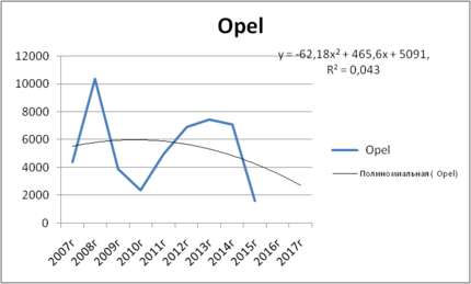 Рассмотрим группу машин General Motors. Как видно из представленного графика 14, машины марки Chevroletне обещают грандиозных продаж. Со второй полоны 2014 года их продажи резко идут на спад, к 2017 году ситуация обещает наладиться, но числа менее значительны, чем у других марок, 7000 штук, хотя в 2008 году их продажи достигали 23 000 машин, разница довольна значительная. У маркиавтомобилей Opel (рисунок 16) ситуация очень похожая, только в 2008 году их продажи составляли 10000 штук. Как известно из СМИ, данная марка покидает авторынок России. Марка автомобилей Cadillac (рисунок 16) в аналогичной ситуации, как и у двух предыдущих марок.