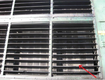 Замятие передних кромок охлаждающих пластин приводит к увеличению аэродинамического сопротивления воздушного тракта вентиляторной установки и, как следствие, к снижению её производительности.