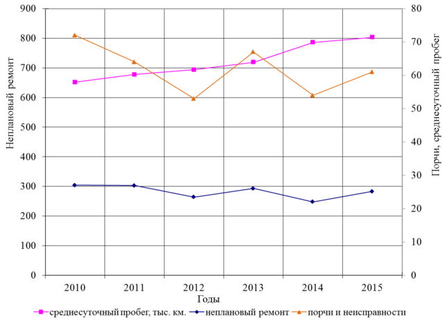 Рисунок 3.2 – Зависимость неплановых ремонтов, порч охлаждающих устройств и среднесуточные пробеги тепловозов за период 2010-2015 г.г.