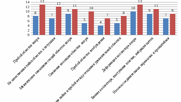 | 3. Межвитковое замыкание секций обмоток якоря | 9 | 11 | +3 |