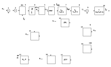1,2 – сравнивающее устройство; 3 – релейный элемент; 4 – блок интегрирования;5 – блок интегрально-цифрового масштабирования;6 – блок регулирования напряжение генератора; 7 – математическая структурная единица обеспечивающая соотношение в верху; 8 – математическая структура возбуждения ТГ и формирования регулировочной характеристики (возбудитель с независимым возбуждением); 9 – блок формирования параметров выходных параметров; 10 – математическая структура сопротивления якоря эл. машин; 11,12 – блок формирования параметров напряжения генератора по обратной связи; 13,14 – блоки контроля параметров частоты вращения и тока; 15,16,17 – блоки формирования сигнала обратной связи на сравнивающее устройство.