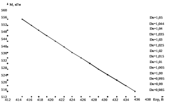 Рисунок 3.6 – График изменения момента вращения на валу двигателя и противо-ЭДС в зависимости от диаметра колеса при скорости движения тепловоза 25 км/ч