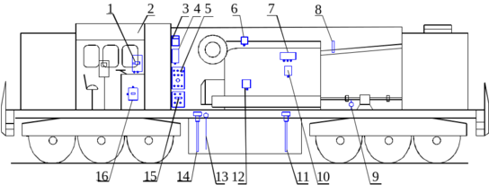 Рисунок 3.1 – Схема расположения подсистем и комплекта датчиков состояния ДГУ на тепловозе типа ТЭМ2: 1 – блок индикаторный; 2 – приемная антенна системы GPS; 3 – высоковольтный делитель напряжения; 4 – датчик мощности; 5 – кросс-блок; 6 – датчик турбонаддува; 7 – распределительный модуль; 8 – датчик температуры контура охлаждения; 9 – датчик оборотов дизеля; 10 – датчик давления топлива; 11 – датчик уровня топлива правый; 12 – датчик давления масла; 13 – датчик воды и температуры топлива; 14 – датчик уровня топлива левый; 15 – блок питания импульсный; 16 – датчик контроллера машиниста.
