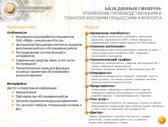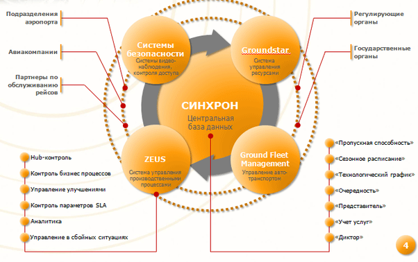 Для работы единой информационной сети предлагается использовать специализированное программное обеспечение по управлению производственной базой данных «Синхрон», в которую были интегрированы готовые программные решения, такие как Ground Fleet Management, Groundstar, Zeus. На территории Центра будут работать не только служащие самого аэропорта, но и компаний партнеров, работающих в аэропорту.