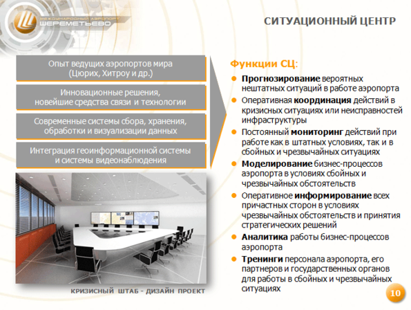 «Ситуационный центр» позволит аэропорту выйти на новый уровень развития, ликвидировать сбои в работе аэропорта и авиакомпаний и организовать взаимосвязь между службами и подразделениями аэропорта.