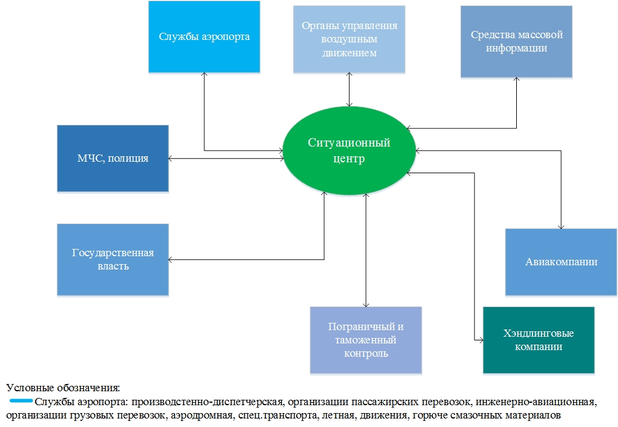 Основная цель создания – централизованная координация действий предприятий и подразделений, которые осуществляют свою деятельность на самой территории аэропорта, на основании опыта аэропорта Шереметьево. Кроме этого, цель заключается в аналитической и технической поддержке процессов и процедур, обеспечивающих минимализацию временных затрат на реагирование, а также улучшение взаимодействий между дежурно-диспетчерскими, оперативными и экстренными службами предприятия (рис.3.5).