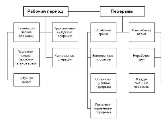 Рассмотрим содержание отдельных составляющих производственного цикла. Рабочий период состоит из времени технологических операций, транспортно-складских операций и контрольных операций.