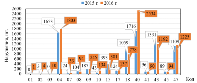 Рисунок 2.2 – Диаграмма сравнения нарушений за 2015–2016 гг.