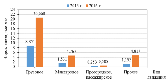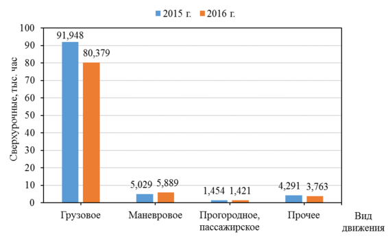 Рисунок 2.4 – Сверхурочные часы по видам движения за 2015–2016 гг.