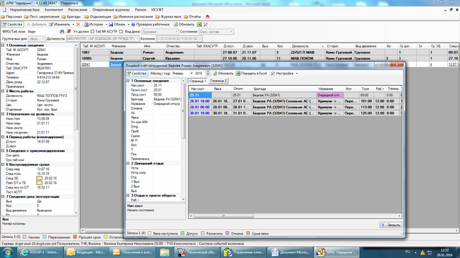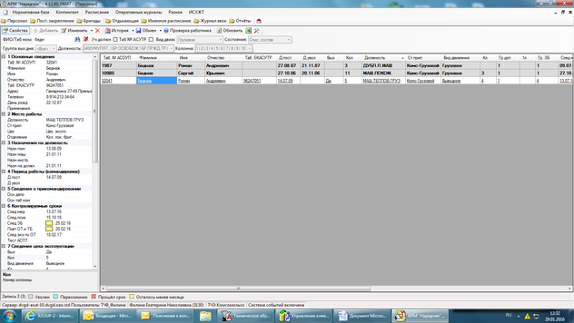 В пункте «Персонал» хранится необходимая для работы нарядчика справочная информация о каждом работнике цеха эксплуатации. В данном разделе указывается все персональные, а также рабочие данные о сотруднике такие как класс работника, колонна к которой он закреплен, дата назначения на должность, все допуски и сроки прохождения тех или иных экзаменов и так далее.
