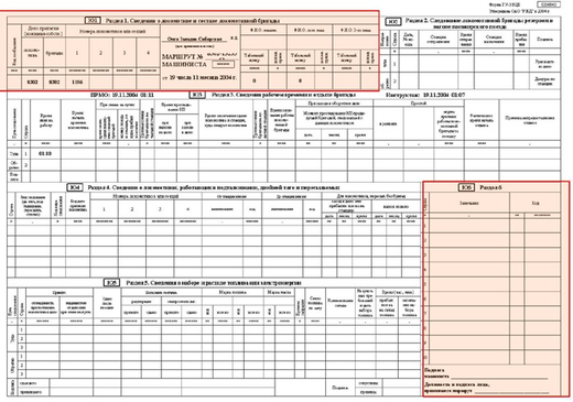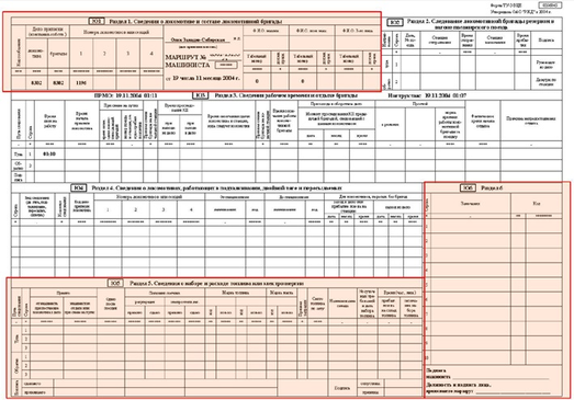 Для повышения достоверности данных в базу электронного маршрута эти сведения представляются системой дорожного уровня АСОУП. Сведения поступают в электронный маршрут, автоматически, сразу после заполнения дежурным раздела 5. Таким образом, перед тем, как бригада отправляется в комнату отдыха, электронный маршрут машиниста, содержит следующие заполненные разделы: