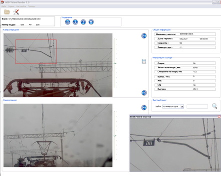 -дополнение видеозаписи с телекамеры в смотровой вышке титрами с информацией о названии перегона, текущем номере опоры, высоте, зигзаге и выносе контактного провода, скорости движения, температуре окружающего воздуха;