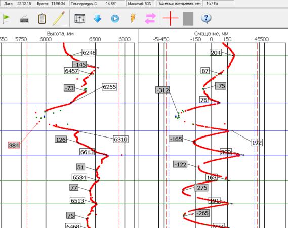 Стереотелевизионная система вагона ВИКС основывается на принципе бесконтактного измерения положения контактного провода. В ней используется блок оптической системы, содержащий три цифровые телекамеры, которые дают информацию о геометрическом положении контактного провода и фиксируют нахождение опор. Вкупе с тензочувствительными датчиками, установленными на токоприёмнике, оператор получает полную картину положения контактного провода, силу нажатия на токоприёмник и величину зигзага. Информация с этих систем попадает на пульт начальника вагона и обрабатывается программным обеспечением MSD Reader, перед тем, как вывестись на экран. Программное обеспечение позволяет структурировать информацию в диагностическую ленту, которая является итоговым материалом инспекционного объезда. Диагностические ленты удобно хранить, они не занимают много места. Программа MSD Reader позволяет сравнивать диагностические ленты двух объездов для получения статистической информации. На этой основе вполне можно сделать статистический центр, который позволил бы накапливать и анализировать информацию о неисправностях и дефектах контактной сети и прилегающей инфраструктуры, однако на деле данной работы не ведётся. Кроме того связка диагностические датчики – программное обеспечение периодически сбоит, выдавая артефакты, показанные на рисунке 3.1.
