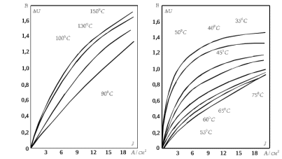 - при повышении температуры коллектора примерна до 70 - 80 °С при всех значениях плотности тока наблюдалось значительное снижение